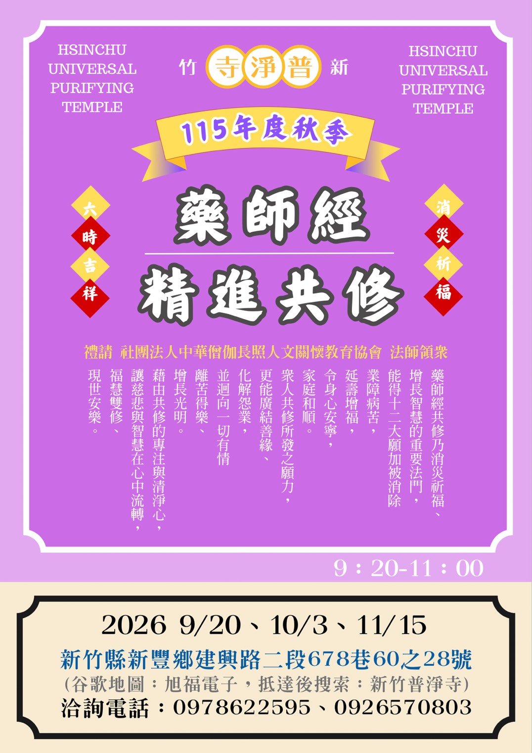 ◎僧伽長照— 115年度秋季(9月-11月) 新竹新豐社區據點 「藥師經共修」