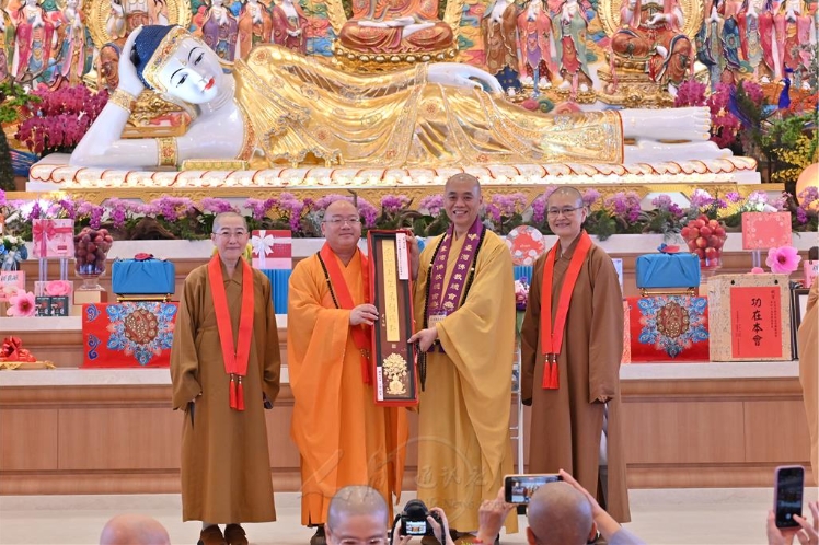 佛光山住持心保和尚致贈佛光山開山祖師星雲大師2026年墨寶「和諧共生‧馬到成功」,同時表示,這場交接盛典不僅是國際化的象徵,更代表台灣佛教界邁出嶄新的一大步。期盼藉由新任理事長會常法師慈悲智慧的領導,讓台灣佛教總會能更上一層樓,普及到世界每一處角落。現今時局動盪,人人莫不盼望世界和平無爭,而佛法即是救世之光。勉勵大眾要對佛法深具信心,護持佛教發展,祈願法輪常轉、正法久住。